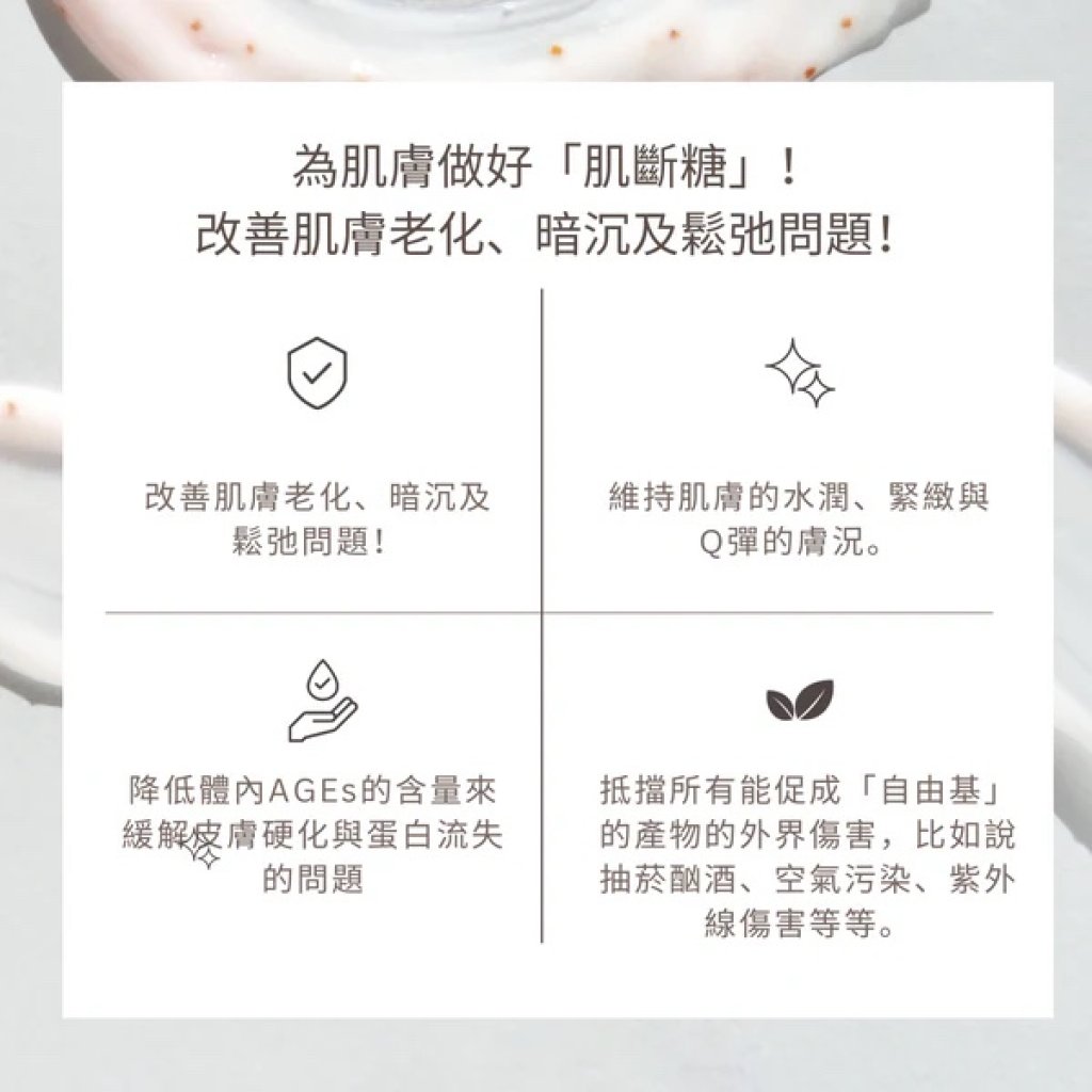 - 改善暗沉、衰老等因糖化而引致的肌膚問題