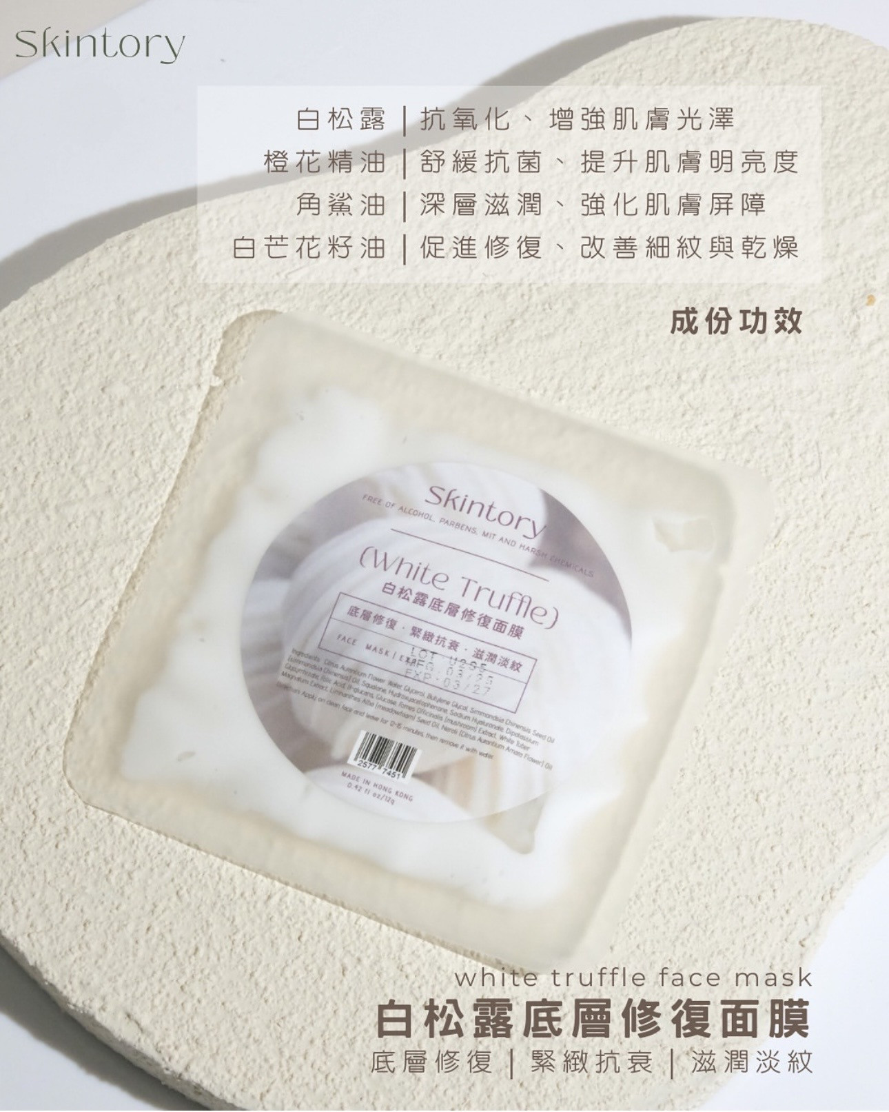 - 抗老與抗氧化: 白松露富含抗氧化成分,能有效對抗自由基,延緩肌膚老化過程,令肌膚保持年輕活力。