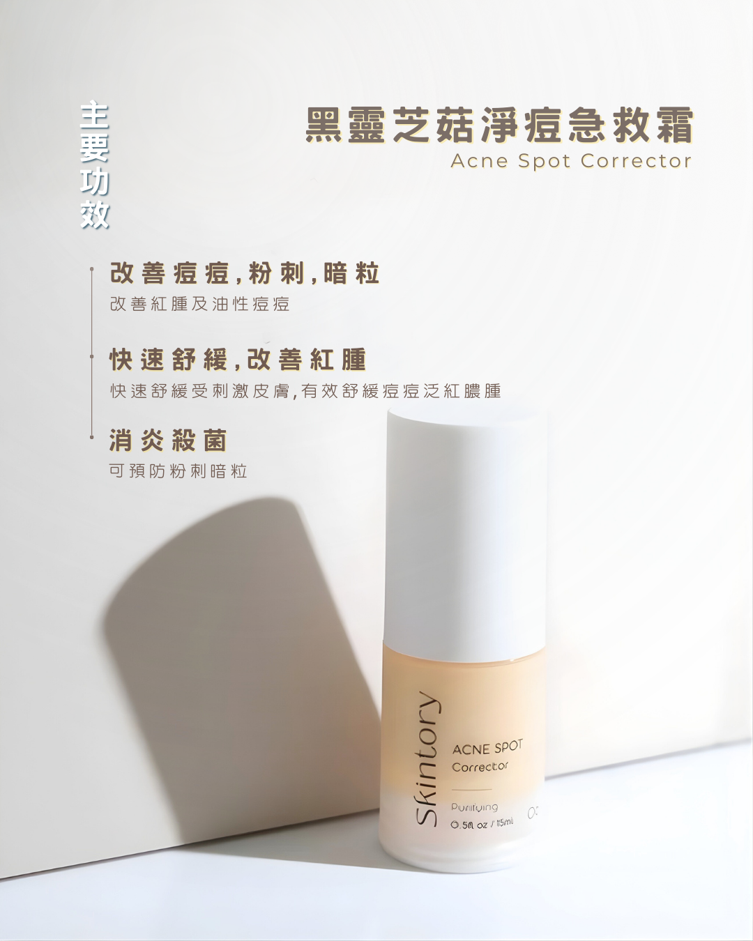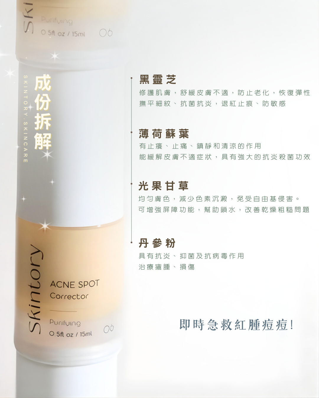 快速舒緩敏感、鎮靜發炎痘痘、修復肌膚屏障,同時達到 保濕、控油、抗氧化,改善粉刺、暗粒和泛紅問題,讓肌膚回復健康穩定與彈潤光澤。它能即時急救紅腫痘痘,長期使用則能強化肌膚免疫力