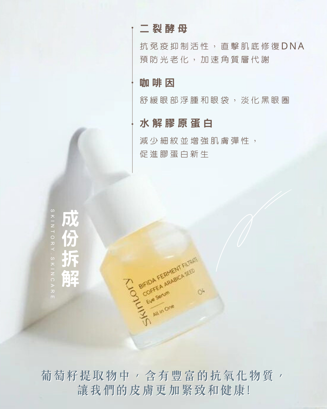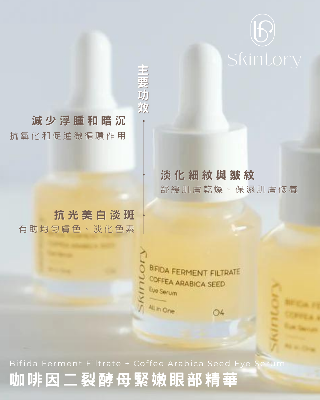 眼周肌膚非常細膩,其厚度為身體其他部位的四分之一,因此會最先暴露疲態和衰老跡象,例如黑眼圈、眼袋和眼紋。 咖啡因就像血管的爽膚水,其特性有助眼部消腫,有助加速眼部皮膚的自我修復能力。具有不油膩、滋潤的作用,助您締造眼眸亮眼。