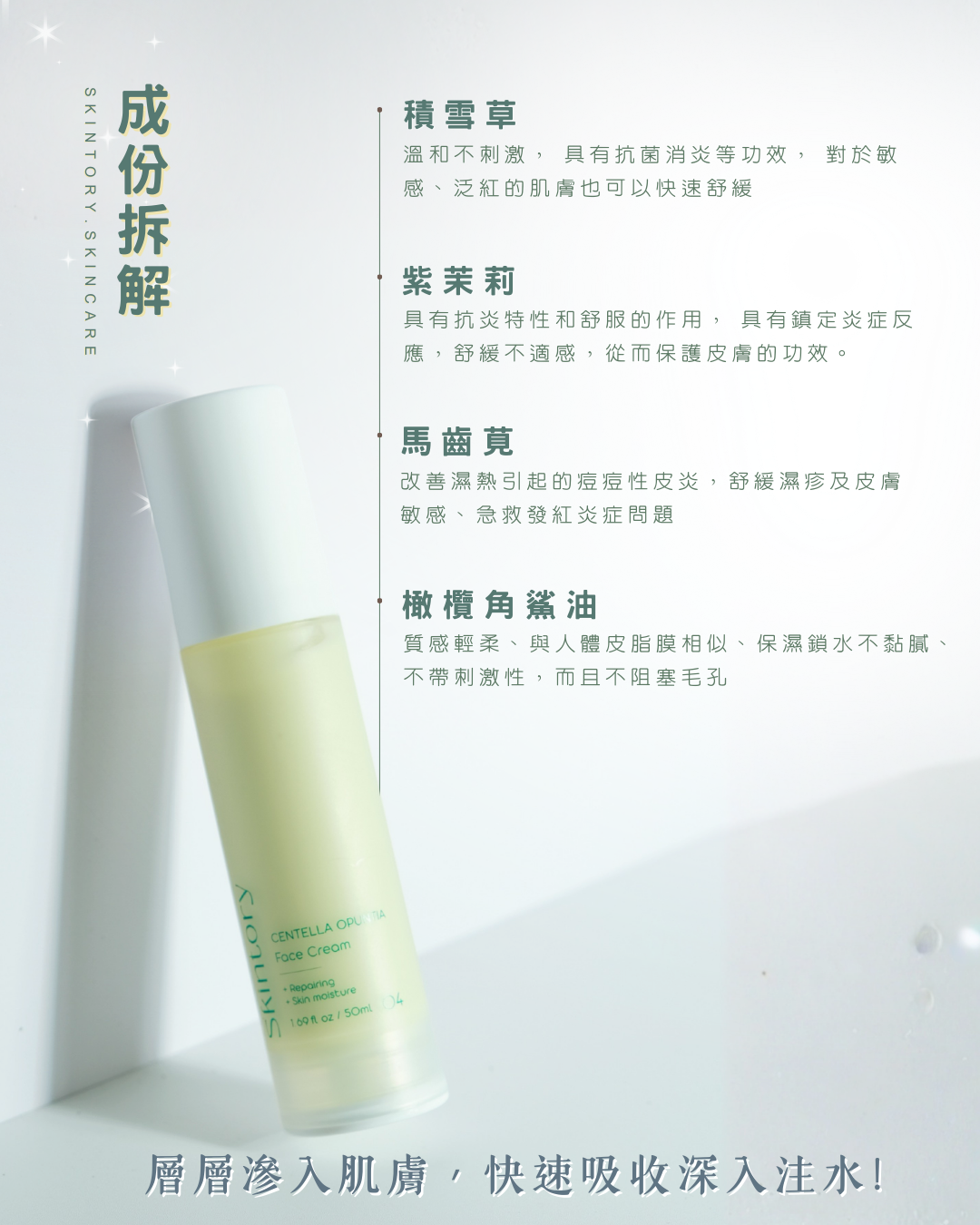 蘊含積雪草及紫茉莉保修復組合成份,層層滲入肌膚,快速吸收深入注水。 全日維持肌膚保濕舒適。