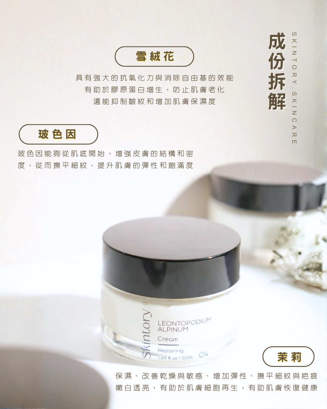 添加了英國珍稀雪絨花萃取,這種高嶺之花天然且獨特,並含有以強效高度抗氧、抗污鎖水聞名的雪絨花酸,以及有效激活肌膚修復再生的雪絨花幹細胞。雪絨花雖然微小,但它有着強大的韌性,它的抗氧力甚至相較護膚界明星成分Retinol(維他命 A 醇)高43%。至於天然胜肽則提煉自大米,取代市面上的合成肽,有助啟動肌膚防護機制,滋養更新細胞。