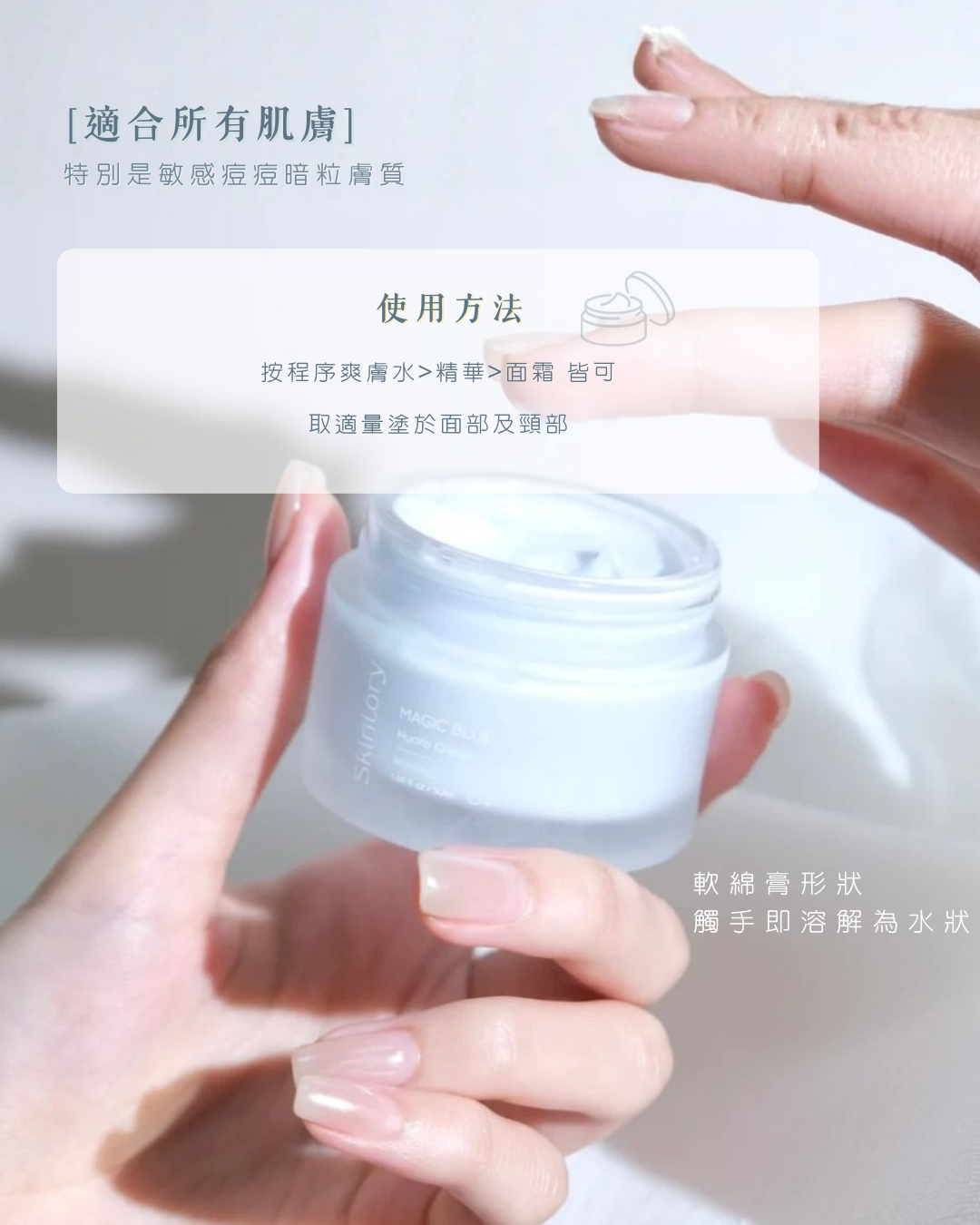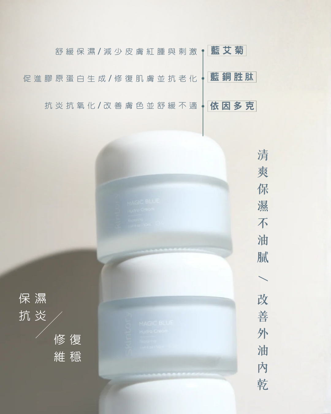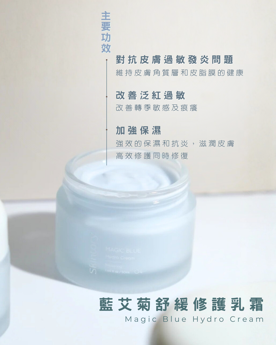 Magic Blue 修護面霜當中含有珍貴的天藍烴,所以呈現如大海般湛藍,Magic Blue 修護面霜功效強大,抗炎性尤為突出。 可以幫助調理皮膚,對抗皮膚過敏、發炎等問題。在處理神經性皮膚炎時具有很好的舒緩效果,能預防痤瘡與濕疹,並緩解頭皮發癢和脂漏性皮膚炎。