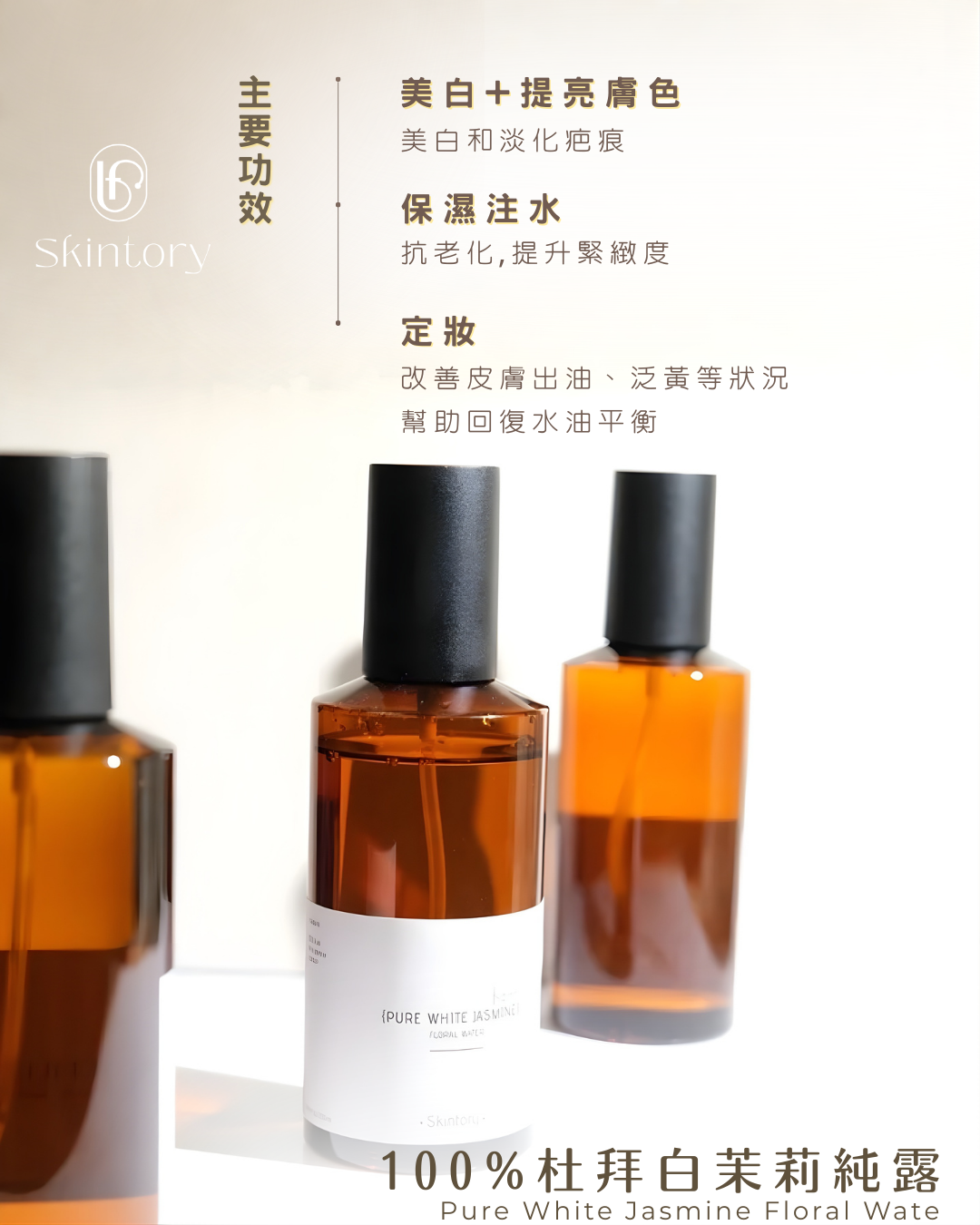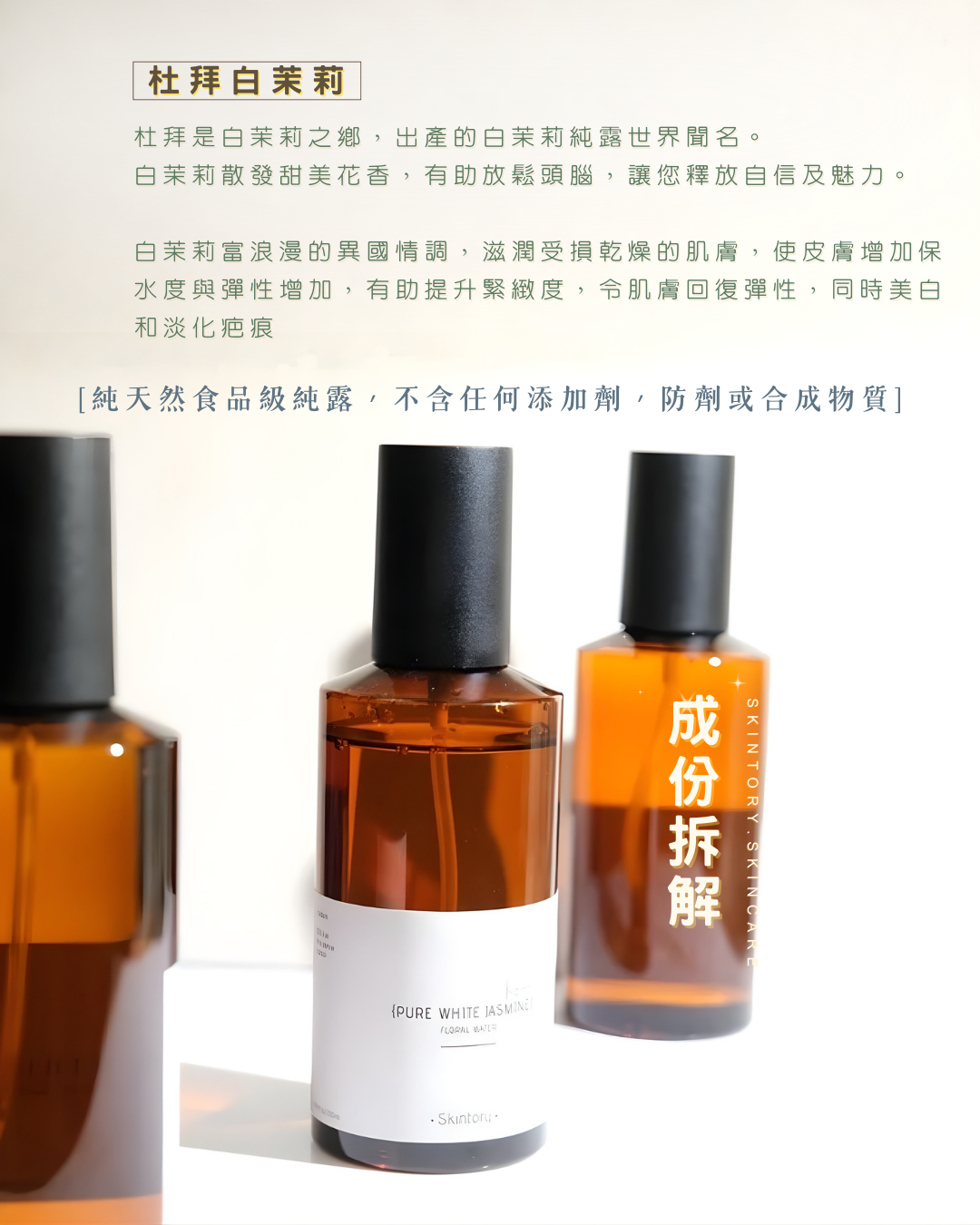 杜拜是白茉莉之鄉,出產的白茉莉純露世界聞名。白茉莉散發甜美花香,有助放鬆頭腦,讓您釋放自信及魅力。白茉莉富浪漫的異國情調,滋潤受損乾燥的肌膚,使皮膚增加保水度與彈性增加,適合各種膚質,有助提升緊緻度,令肌膚回復彈性,同時美白和淡化疤痕,特別是暗啞,乾性及成熟細紋膚質。
