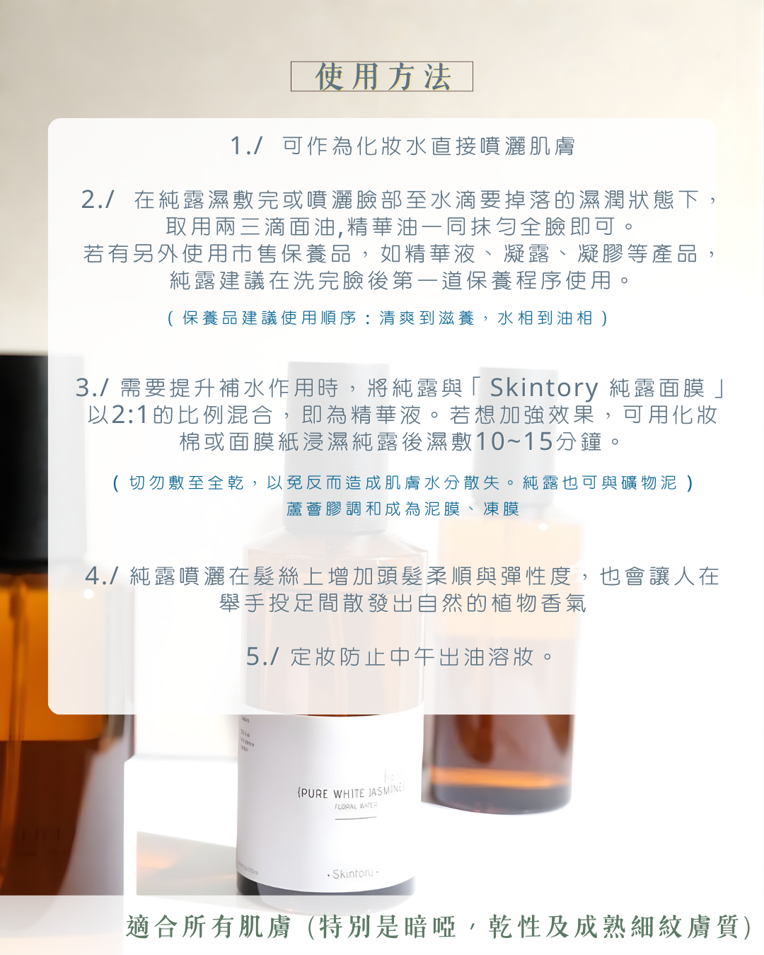 3. 需要提升補水作用時,將純露與「Skintory 純露面膜」以2:1的比例混合,即為精華液。若想加強效果,可用化妝棉或面膜紙浸濕純露後濕敷10~15分鐘。切勿敷至全乾,以免反而造成肌膚水分散失。純露也可與礦物泥、蘆薈膠調和成為泥膜、凍膜。