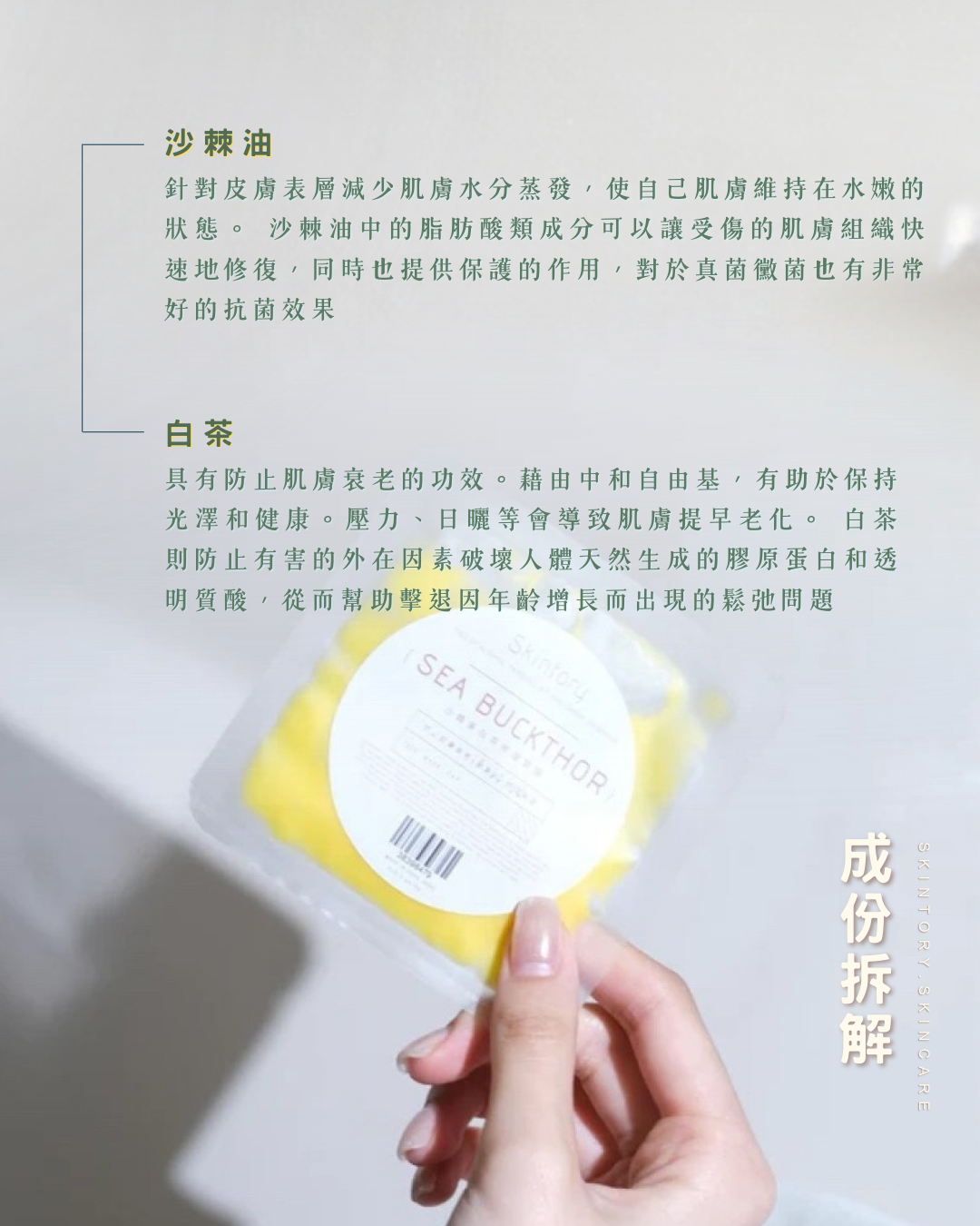 對皮膚可以提供非常好的保濕效果,其中含有的碳氫化合物、磷脂,可以針對皮膚表層減少肌膚水分蒸發,同時滋潤肌膚,使自己肌膚維持在水嫩的狀態。 沙棘油中的脂肪酸類成分可以達到護膚的效果,讓受傷的肌膚組織快速地修復,同時也提供保護的作用,對於真菌黴菌也有非常好的抗菌效果。 - 白茶
