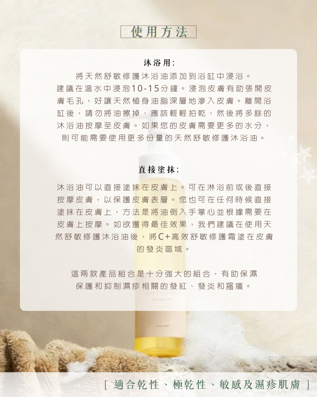 沐浴油也可以直接塗抹在皮膚上。可選擇在淋浴前或後直接按摩而皮膚,以保護皮膚表層。您也可以在任何時候直接塗抹在皮膚上,方法是將油倒入手掌心並根據需要在皮膚上按摩。如欲獲得最佳效果,我們建議在使用天然舒敏修護沐浴油後,將C+ 高效舒敏修護霜塗在皮膚的發炎區域。這兩款產品組合是十分強大的組合,有助保濕、保護和抑制濕疹相關的發紅、發炎和瘙癢。