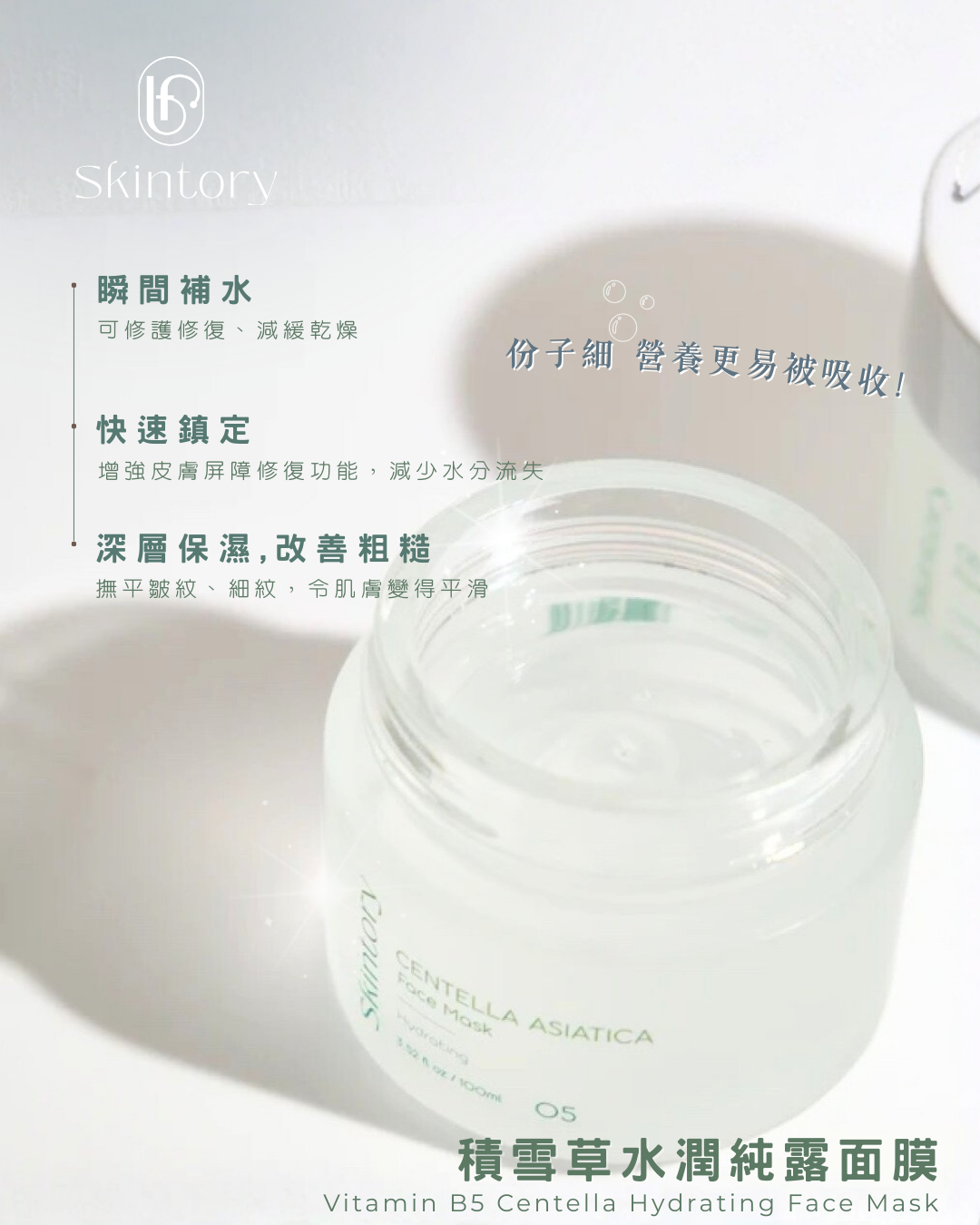 蘊含積雪草4重保濕組合成份,配以維他命B5的黃金三角配方成份,層層滲入肌膚,快速吸收深入注水。