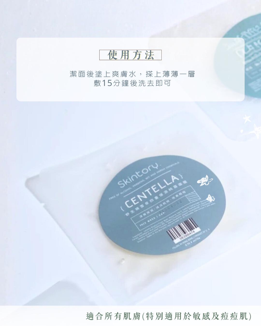 潔面後塗上爽膚水,搽上薄薄一層,敷15分鐘後洗去即可。