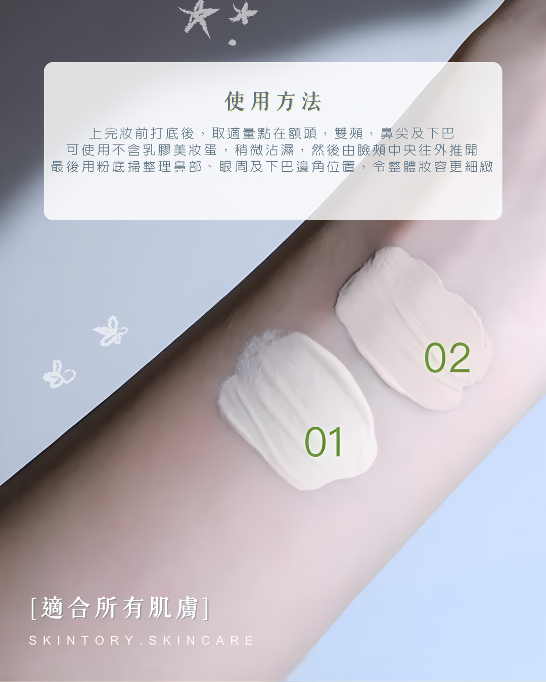 上完妝前打底後,取適量點在額頭,雙頰,鼻尖及下巴。可使用不含乳膠美妝蛋,稍微沾濕,然後由臉頰中央往外推開。最後用粉底掃整理鼻部、眼周及下巴邊角位置,令整體妝容更細緻。