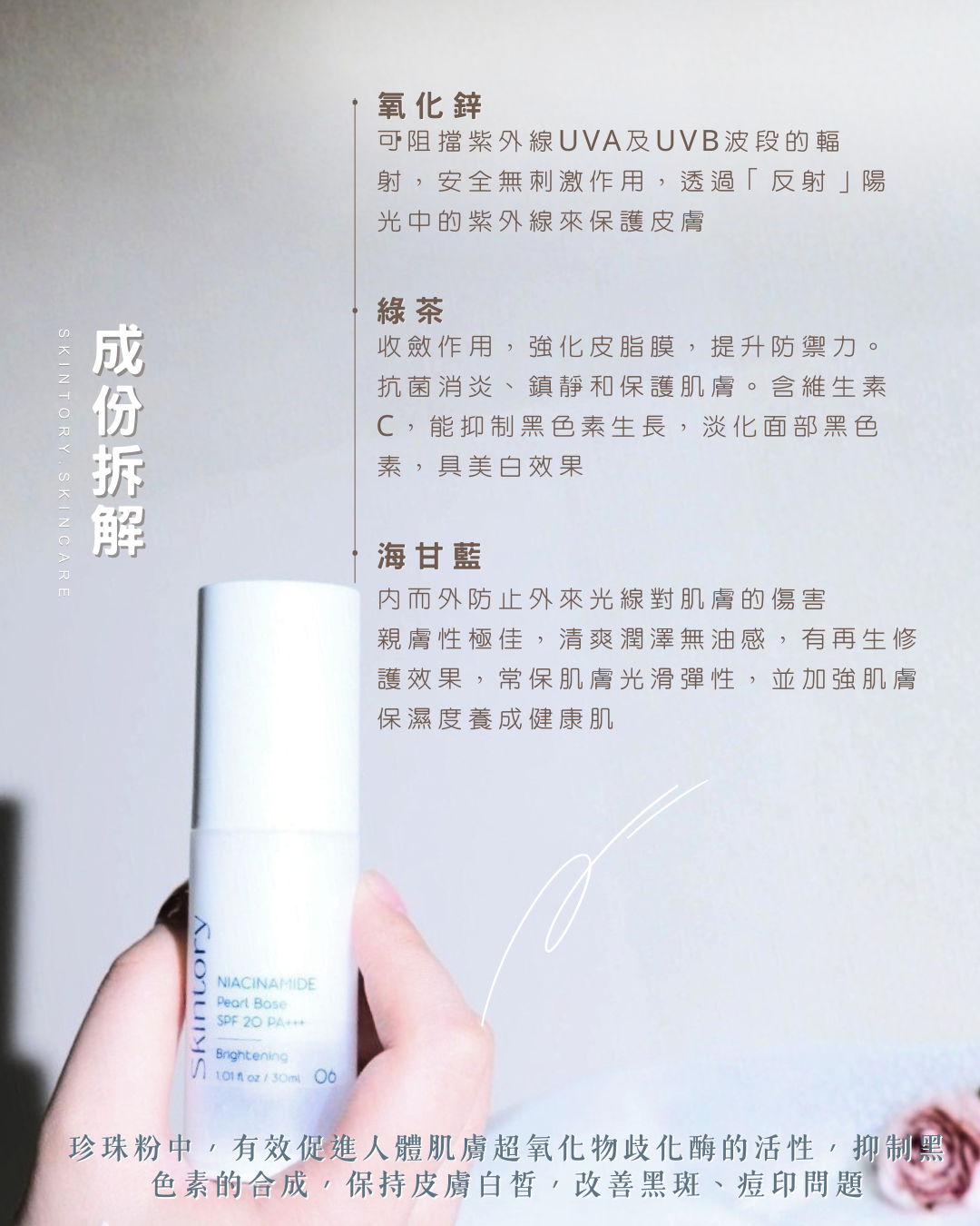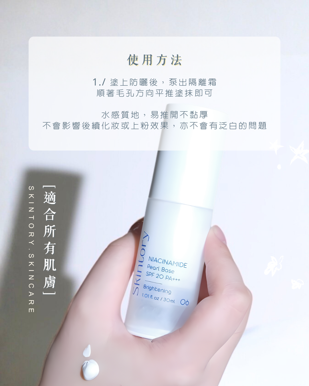珍珠粉能有效改善膚色暗沉。 珍珠粉富含氨基酸、鈣和多種礦物質,同時具有抗氧化,消炎等等的功效。質地清爽,上面不會有負擔感,質地細緻輕盈,完美撫平臉部瑕疵並均勻膚色,賦予肌膚青春白皙的自然光采長達八小時之久。 上妝前可使用它當作防曬及隔離,保濕又方便。