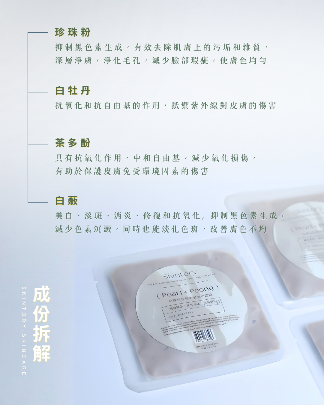 • 珍珠粉 : 抑制黑色素生成,從而達到美白效果有效去除肌膚上的污垢和雜質,深層淨膚,淨化毛孔,減少臉部瑕疵,使膚色均勻。