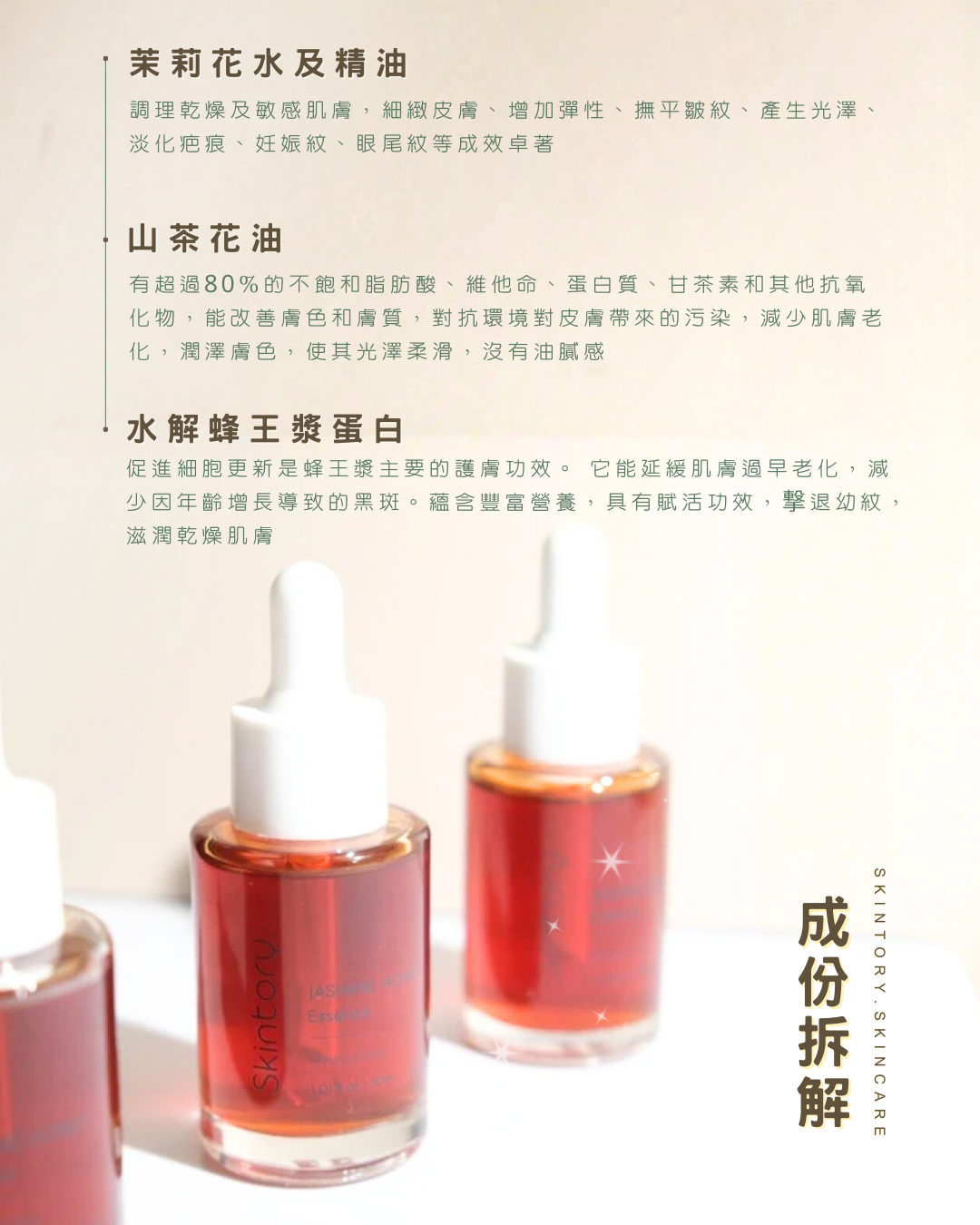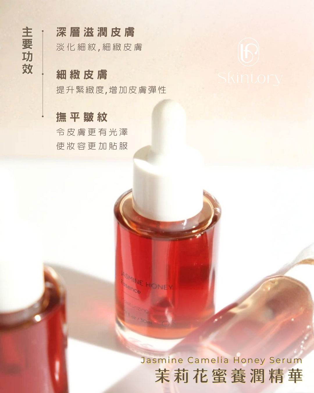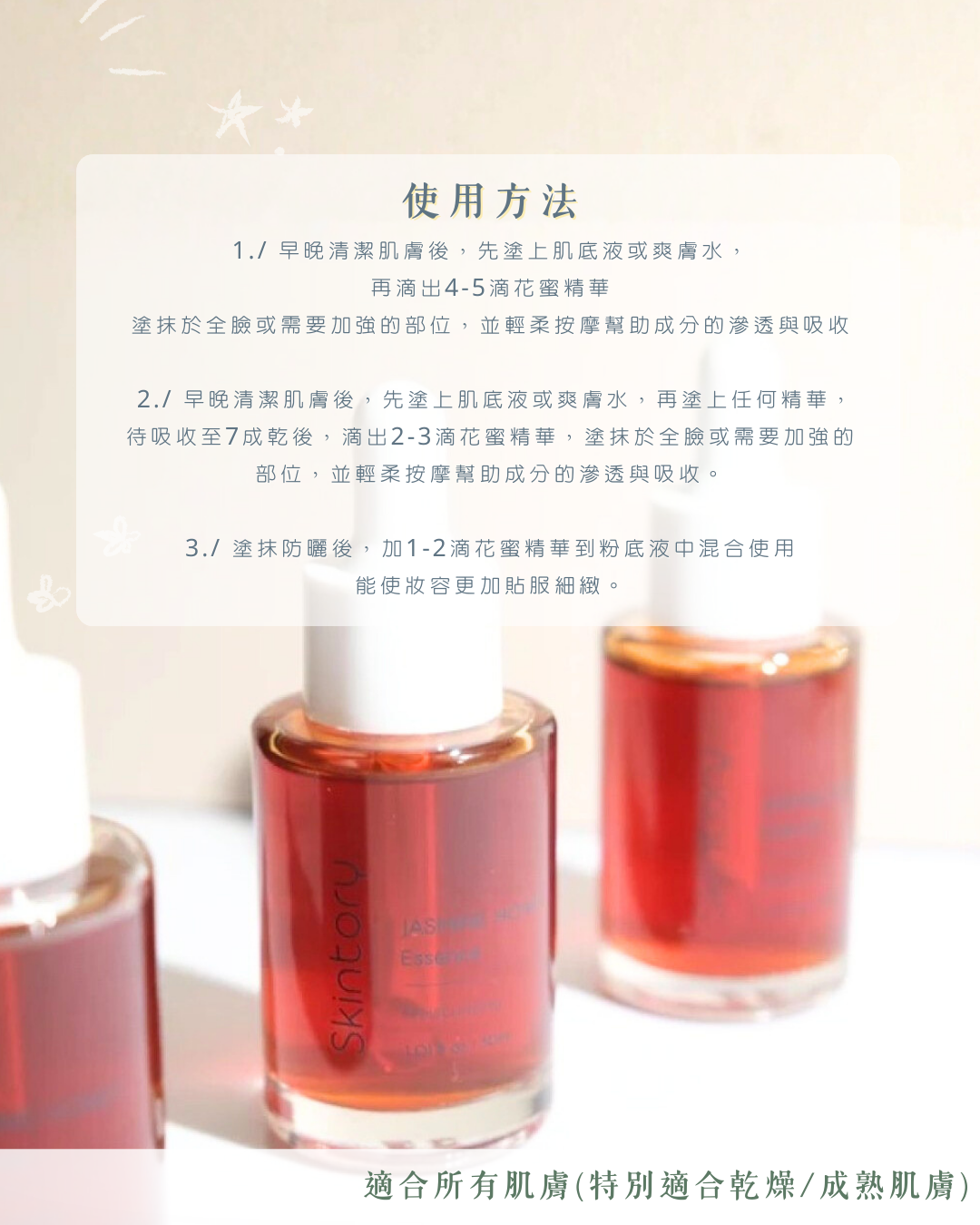 花蜜精華的質地比較濃稠滋潤,特別適合乾燥缺水的肌膚,入面含有茉莉精油,可以調理乾燥及敏感肌膚,細緻皮膚、增加彈性、撫平皺紋、產生光澤、淡化疤痕、妊娠紋、眼尾紋等成效顯著。