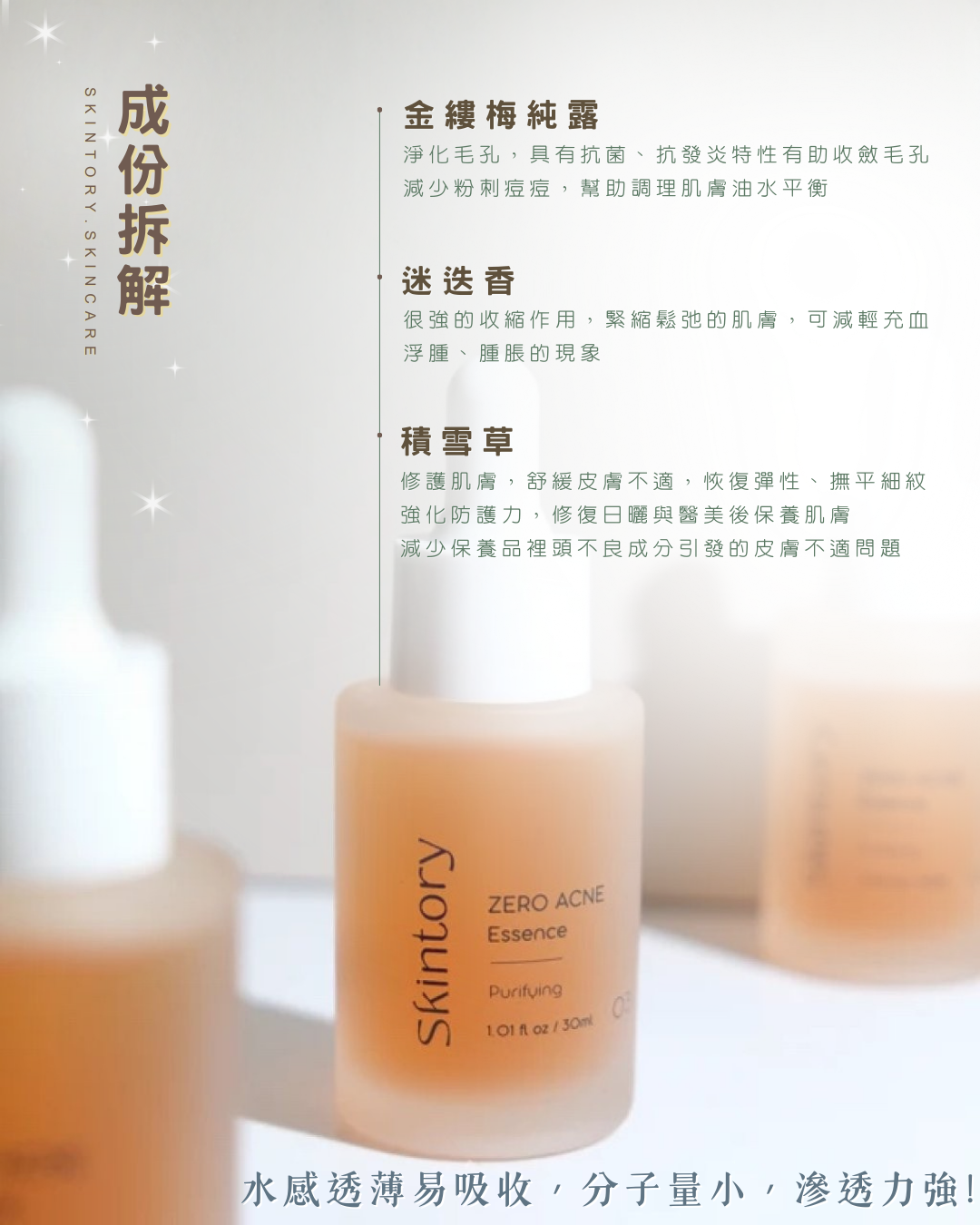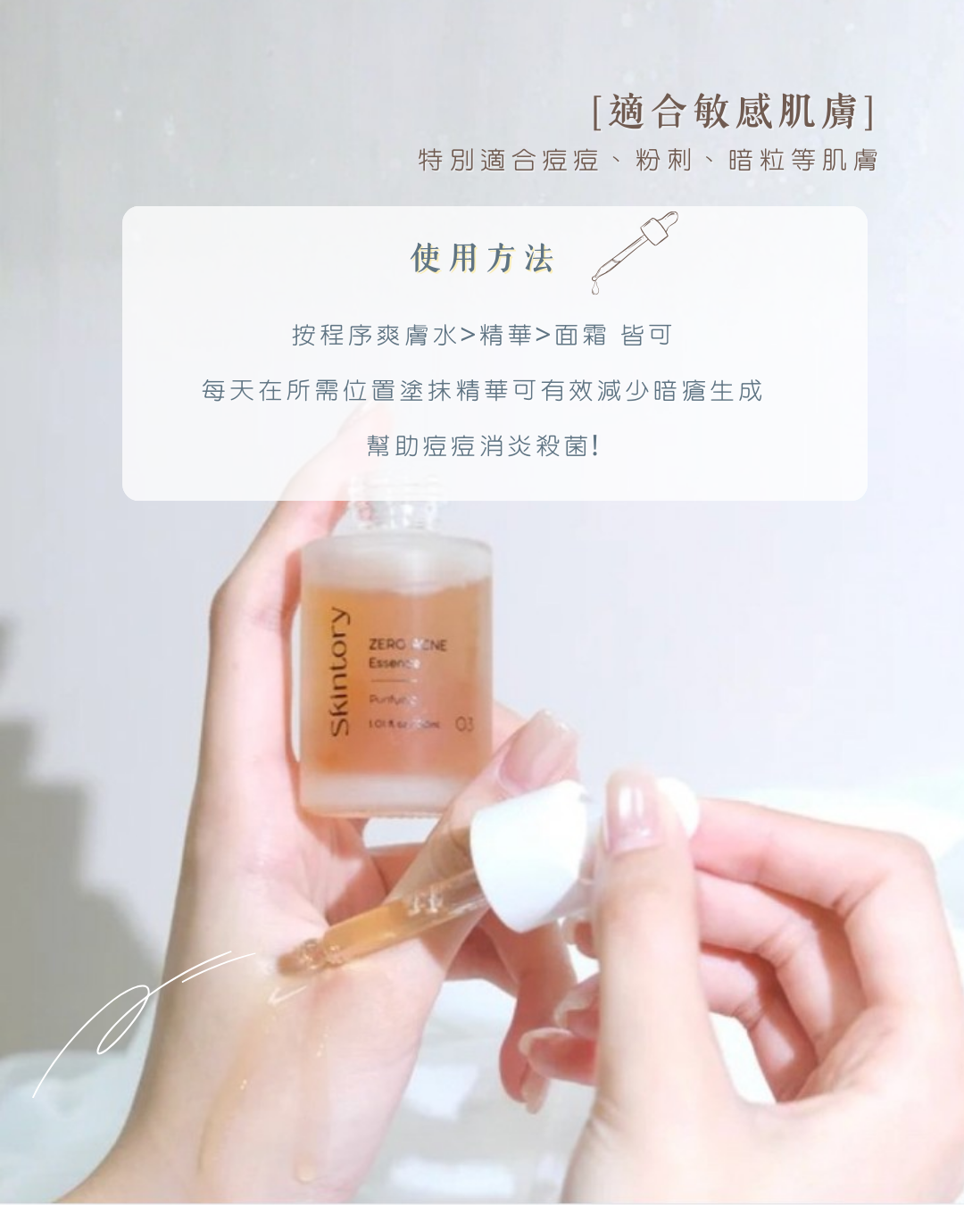 每天在所需位置塗抹精華可有效減少暗瘡生成,幫助痘痘消炎殺菌,亦可預防粉刺暗粒。另外,特別加入迷迭香成份,更可有效收細毛孔,減少油脂污垢堵塞的問題!